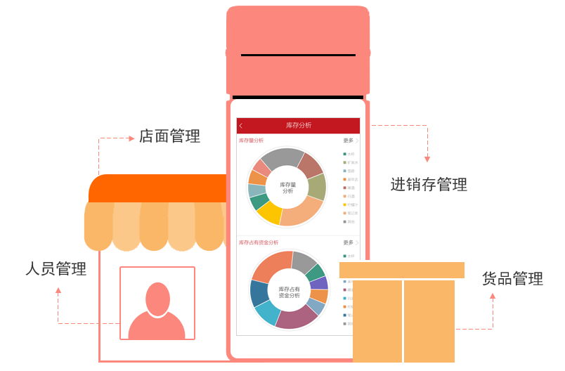 惠商+智能pos自带的进销存系统是一款管理进货、销售、仓库管理、营业数据分析统计的